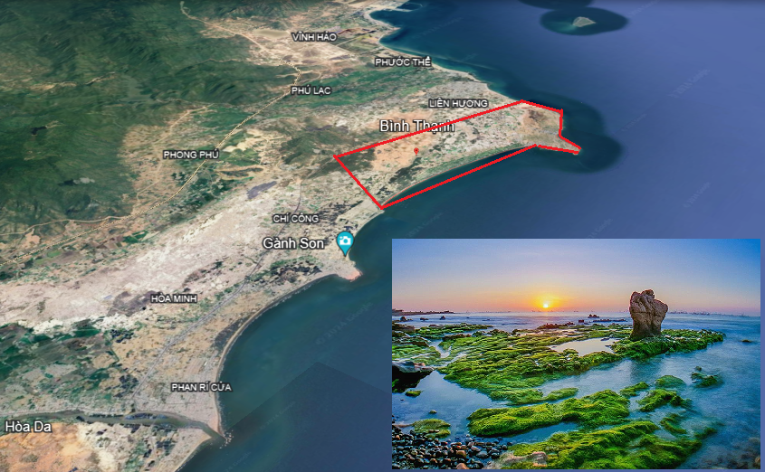 Khu vực quy hoạch có bờ biển dài khoảng 17 km, bãi biển thoải, cát mịn, sạch và còn hoang sơ. Với vị trí địa lý nằm trong xã Bình Thạnh, giữa thị trấn Liên Hương và xã Chí Công là vùng động lực phát triển kinh tế biển của huyện Tuy Phong, là trung tâm tuyến du lịch ven biển Phan Thiết – Nha Trang.